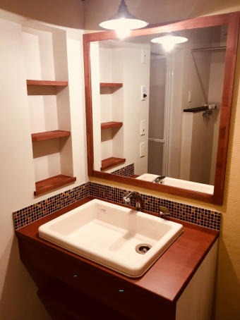 タイルの色使いや棚の色、照明等、可愛いポイントが沢山あります。