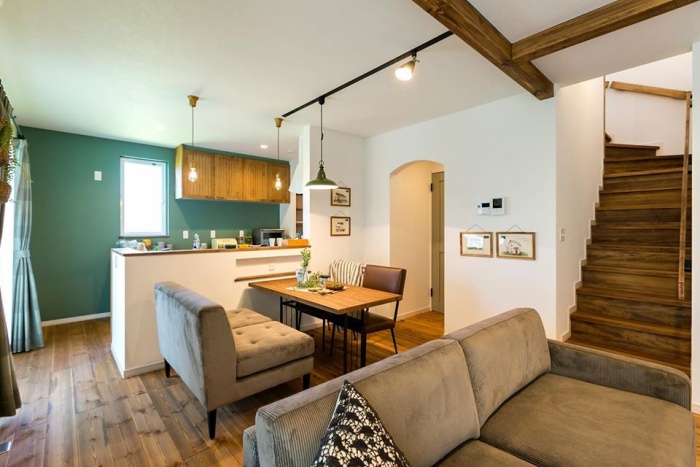 壁一面をグリーンのアクセントクロスにしたおうち。