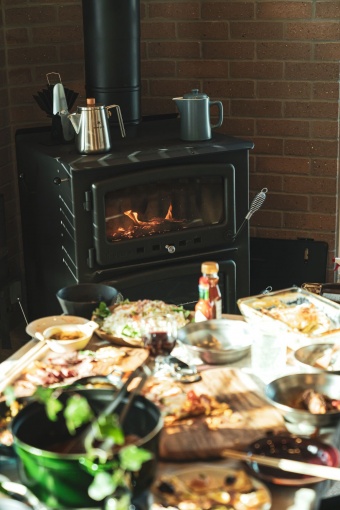 薪ストーブで焼いたピザや、グラタン、アヒージョなどをおしゃれに並べて撮影。*
