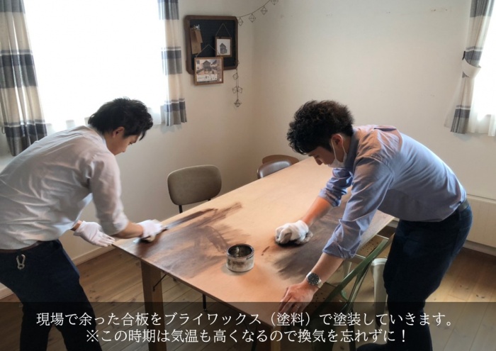北飯岡モデルハウスの打ち合わせスペースに、マネージャーの高橋とスタッフの内洞が分譲地の告知ブースをDIY。