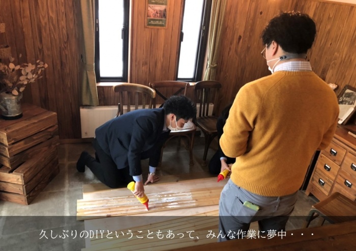 そこにディスプレイするダイニングテーブルをスタッフみんなでDIYしました!!