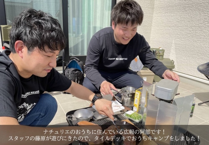 先日、スタッフの藤原が遊びにしたのでタイルデッキでおうちキャンプをしました。