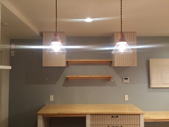 右の段違いのカウンターは台所としてだけでなく、パソコンや軽作業も出来るようにと