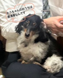 ミニチュアダックスフンドのむう(7さい・♀)です。皆には“むうちゃん”って呼ばれています。身体は黒と白のおうしさんカラーで、足先は茶色と白のまだらミックスが特徴です。恥ずかしがり屋ですが、実は甘えたさんなので、ご来店の