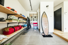 S様:「キャンプ道具やゴルフなど、外遊びのアイテムがたくさんあるので、せっかくならと大切なアウトドア用品を並べて見せる収納にしました。天気が悪くても室内でお手入れができるのも助かります!」
