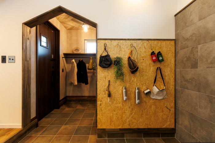 土間や有孔ボードを活用した見せる収納が、