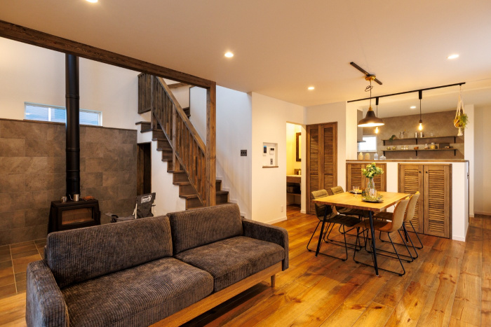 薪ストーブと吹き抜け階段が生み出す開放的な空間のお家です。