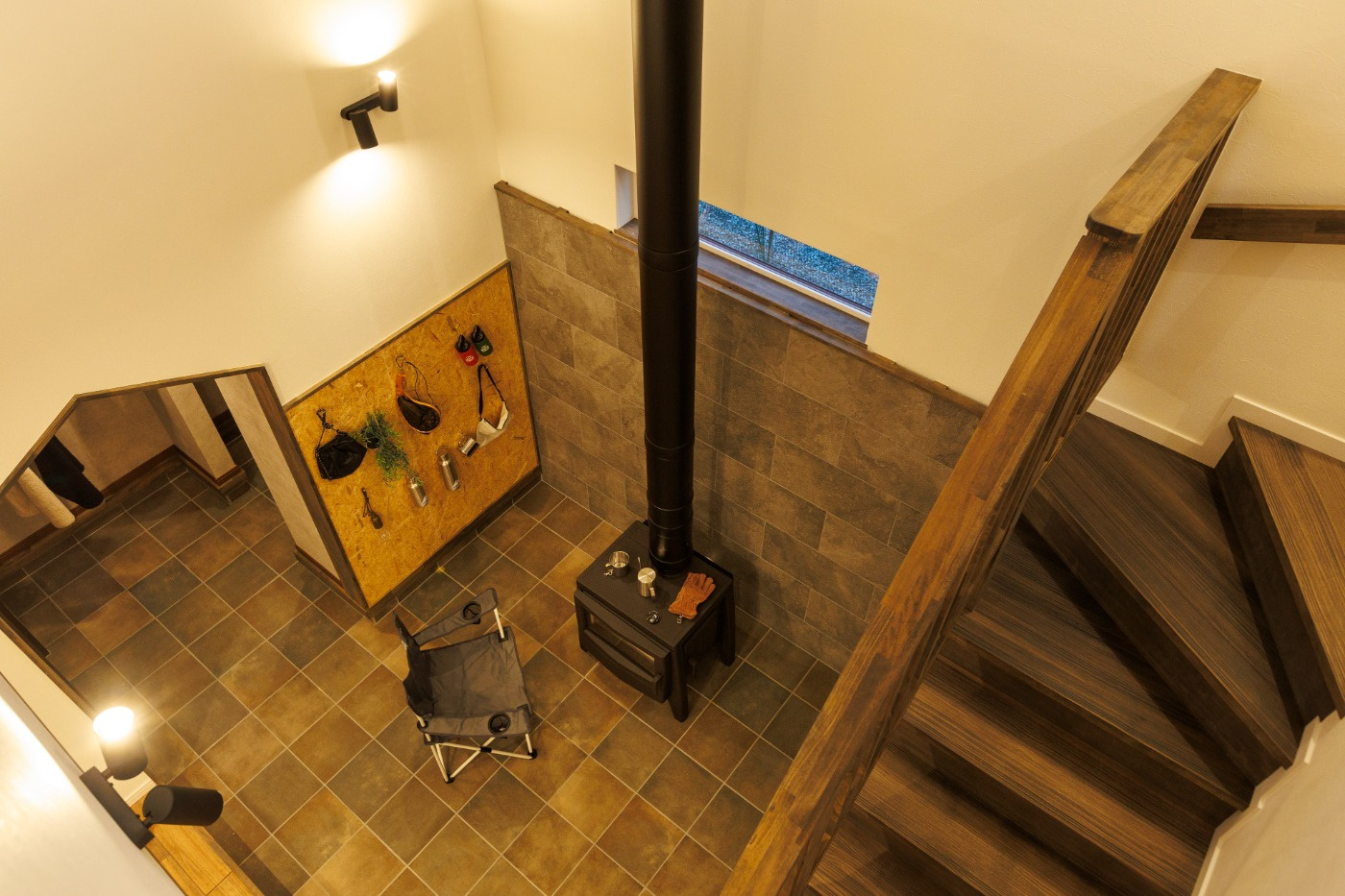 薪ストーブと吹き抜け階段のある家