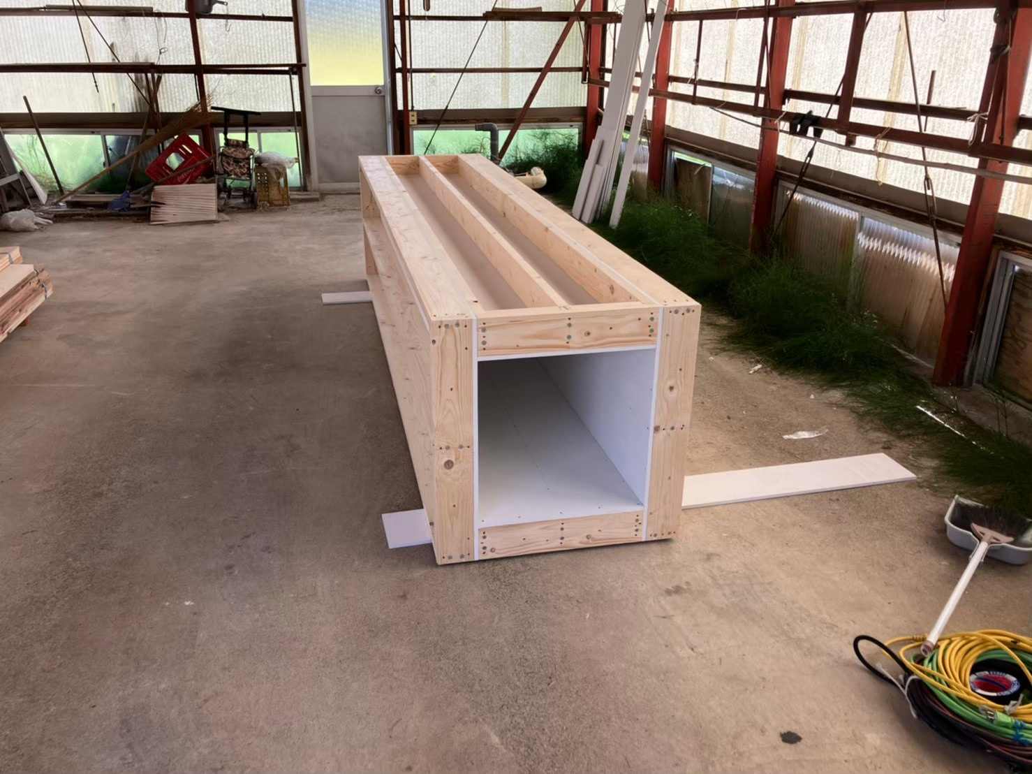 煙突を屋根上まで出すうえで、やはり熱を持つ筒ですので、不燃材で覆った枠を作り、室内から屋根上までの煙突用の箱を作ります。
