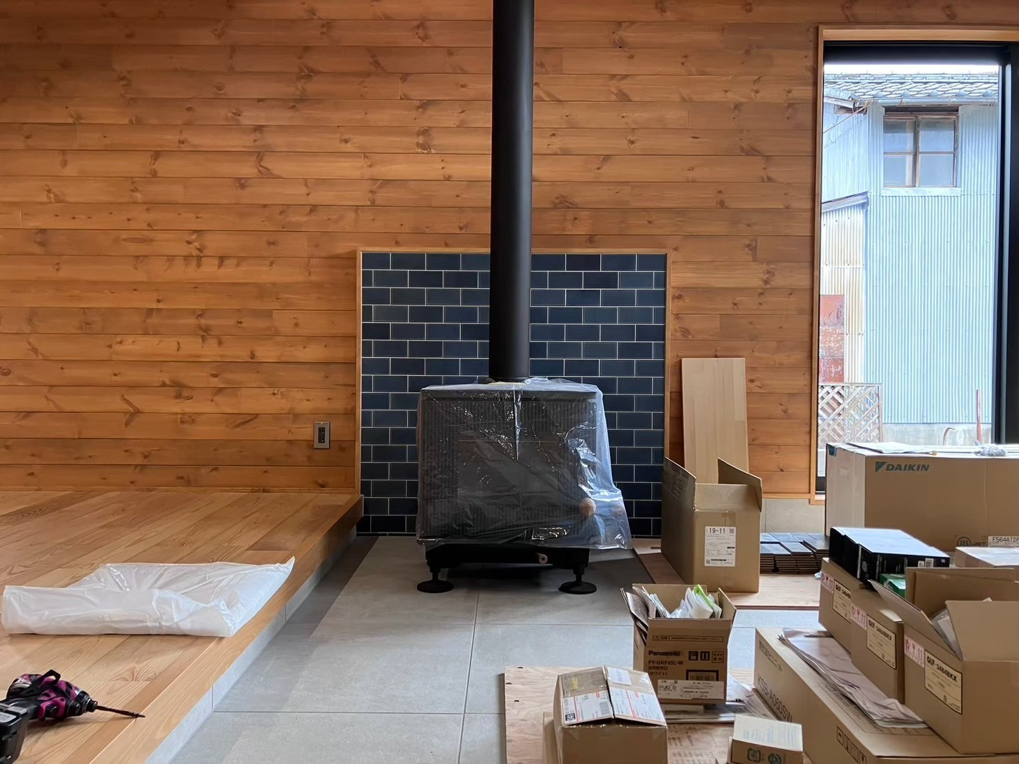 床、背面、側面をタイル仕上げ、ストーブに接する壁には、やはり断熱シートを入れたふかし壁にします。