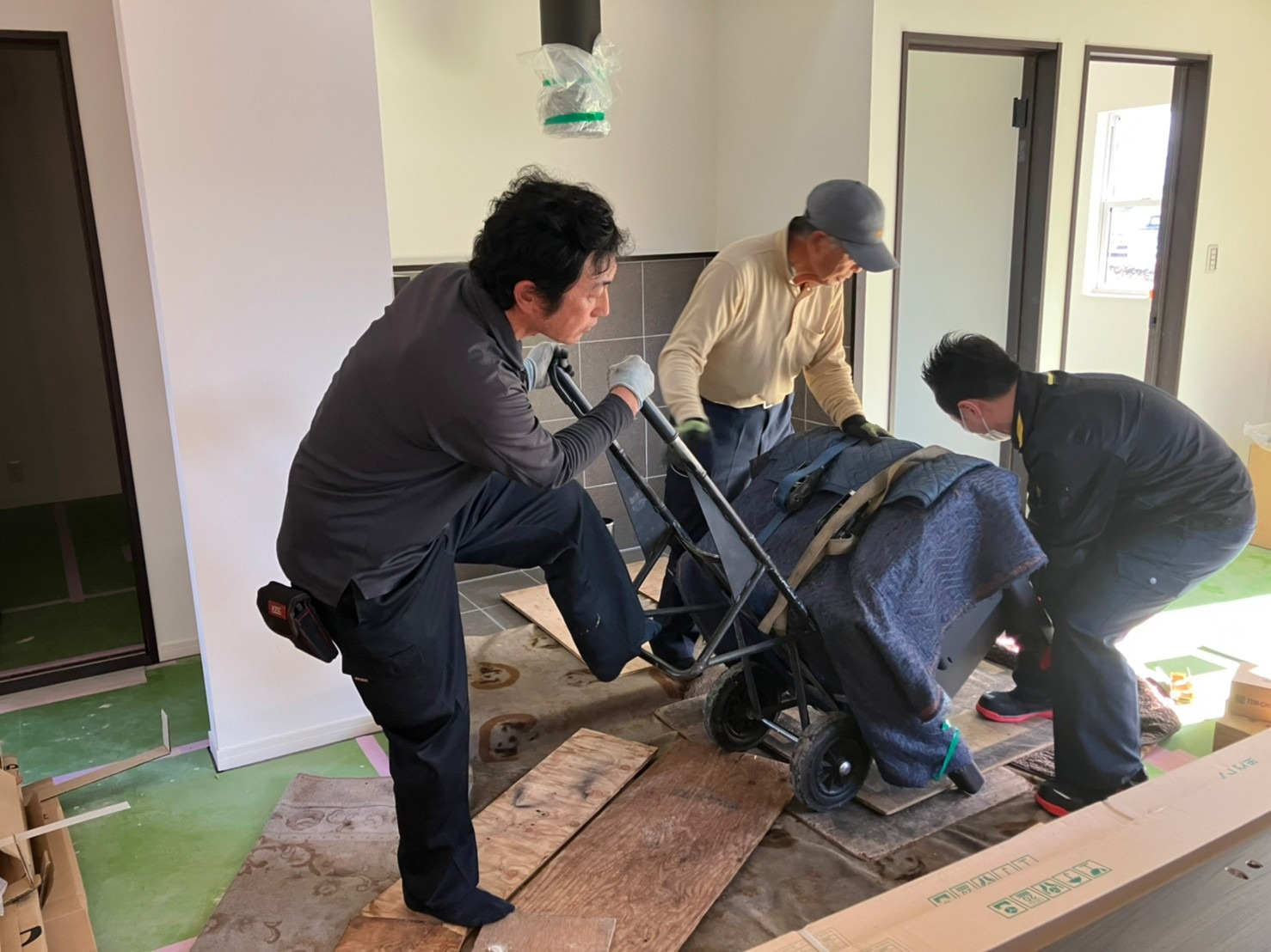 仕上げ工事が進んだところで、ストーブの設置です。薪ストーブはいろんなメーカーさんが取り扱っていますが、本体の鉄が温まった遠赤外線が薪ストーブの魅力ですので、本体は、重い。搬入も一苦労ですし、新築の現場ですので、よく養生をして搬入します。