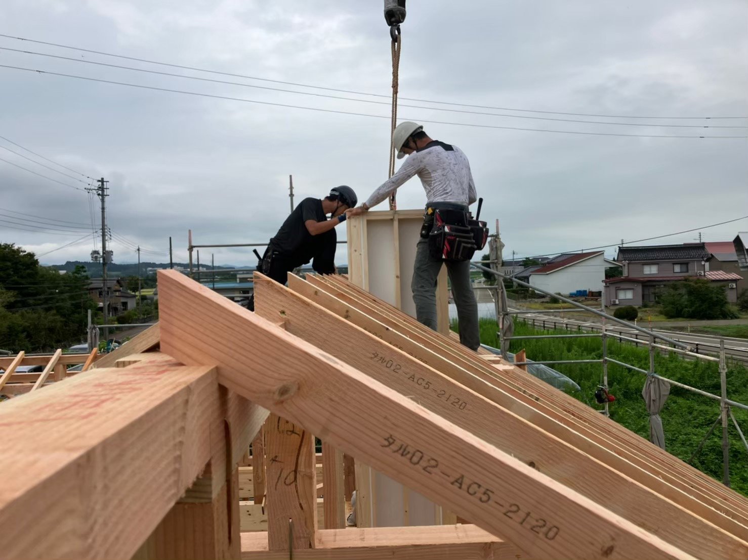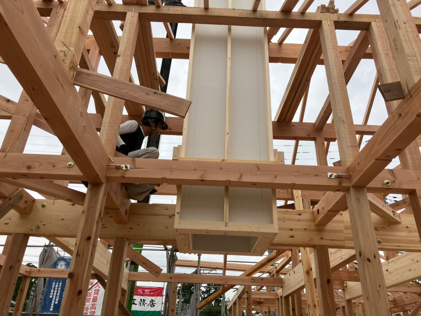 箱の壁はケイカル板と、中には断熱材を入れます。重さもありますし、上棟時にレッカーで吊り込んで取り付けます。