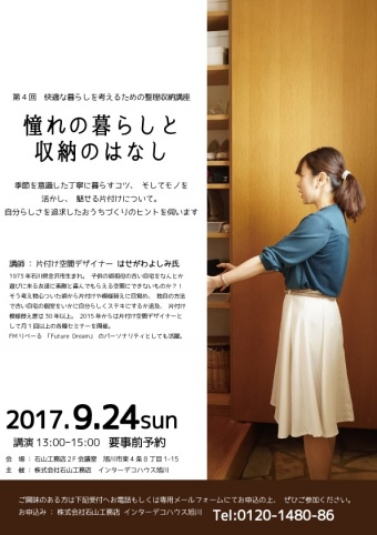 セミナー受講後は『片づけしたくなる!!』とママたちに大人気の片付け空間デザイナーのはせがわよしみさんを講師に迎え、“憧れの暮らしと収納のはなし”と題し、主婦目線からの片付けからはじまる自分らしさを追求した暮らし方についてお話いただきます。