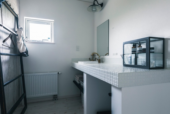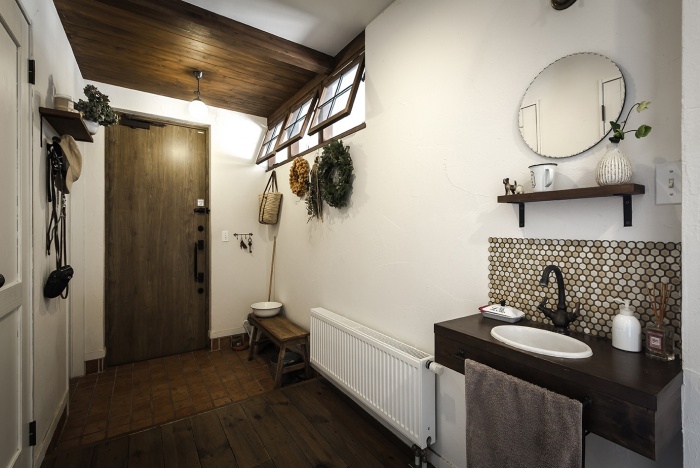 例えば、鏡の枠をヴィンテージ感のある素材のものにしたり、水道の蛇口を錆びた色合いの古いデザインのものにしたり。