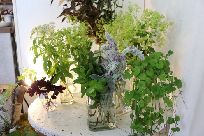 カンガルーファクトリーは、なるべく自分たちで育てた草花を使っています。ご夫婦が愛情を込めて手入れしている広い庭は、ハーブを中心にやさしい色合いの草花がいっぱい。朝摘みのフレッシュなものや、市場には売っていない草花たちを使って、アレンジの幅も広がったそうです。