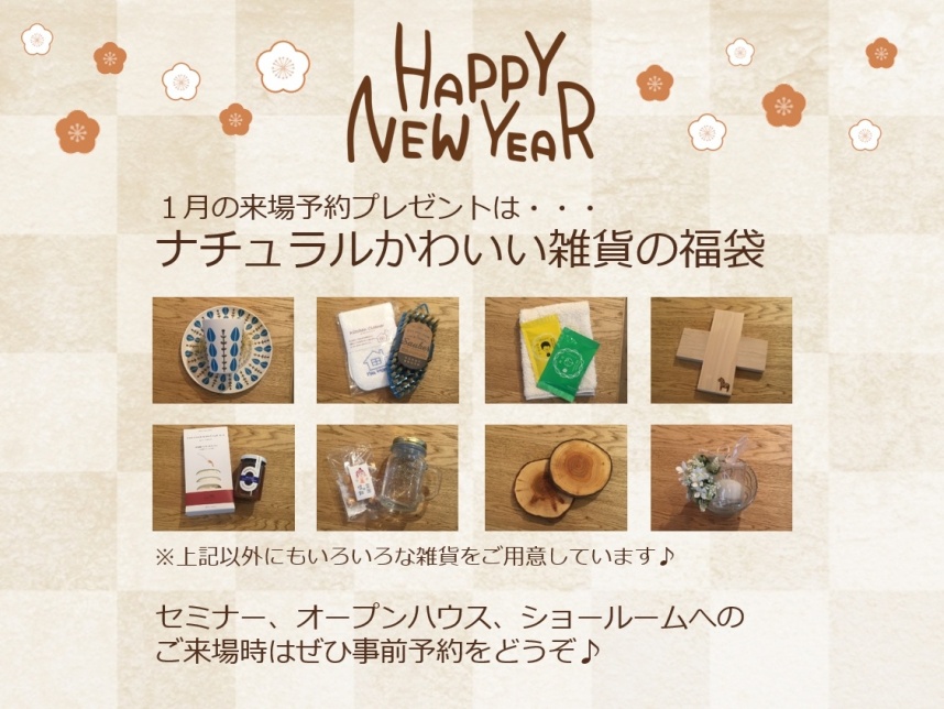 1月の来場予約プレゼント このイベントは終了いたしました。たくさんのご来場ありがとうございました。 毎月かわる来場予約プレゼントのお知らせです♪ 1月はナチュラルかわいい雑貨の『福袋』をプレゼント^^ ▼お問合せ・ご予約は下記フォームから ▼お電話からはこちら 025-288-1039