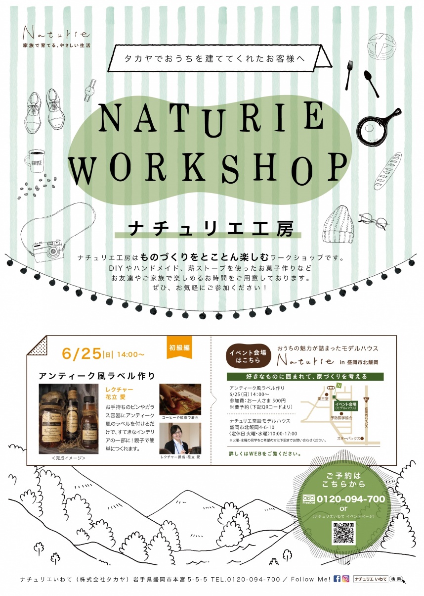 盛岡市北飯岡 6/25(日)14:00〜 【ナチュリエ工房】アンティーク風ラベル作り このイベントは終了いたしました。たくさんのご来場ありがとうございました。 今すぐお申し込み! イベント参加予約 ナチュリエ工房はものづくりをとことん楽しむワークショップです。 D I Y やハンドメイド、薪ストーブを使ったお菓子作りなど お友達やご家族で楽しめるお時間をご用意しております。 ぜひ、お気軽にご参加ください!