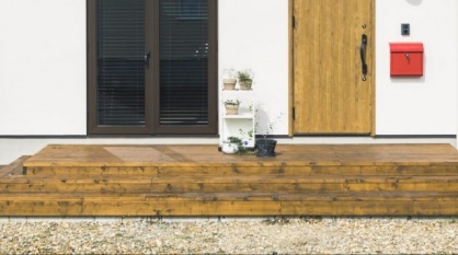 リビングとしても、庭としても利用できる位置に配置されたウッドデッキ。