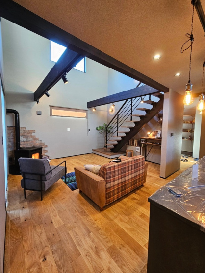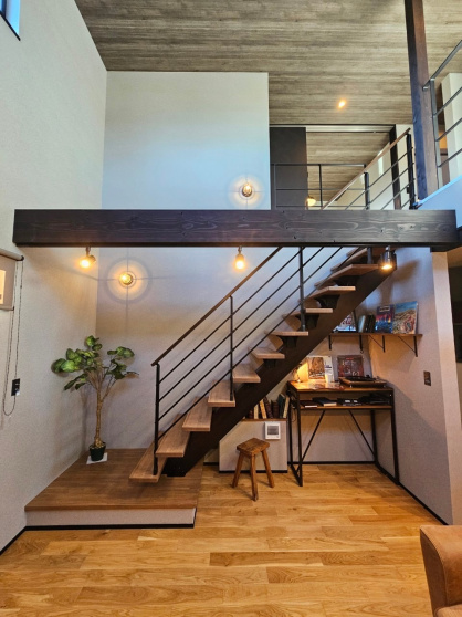 ブラック×木の無骨さと、宙に浮くような開放的なデザインがかっこいいい、人気のオープン階段