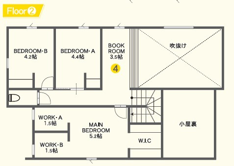 勾配天井の広々吹抜けが1.5階建ての最大限の特徴。