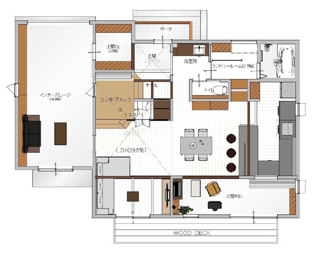 ガレージから庭にも広々土間収納にも直結。ママもうれしい帰宅動線を実現。