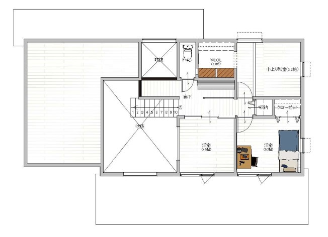 1.5階建ての特徴の勾配天井でここ最近再注目の低天井の空間演出をしております。
