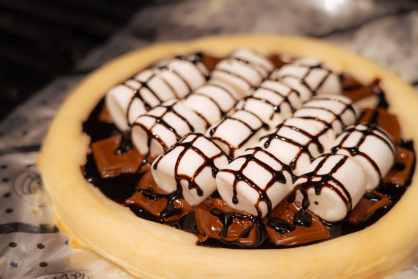 オーブン付き薪ストーブで自分でトッピングしてチョコレートピザを焼いてみよう。