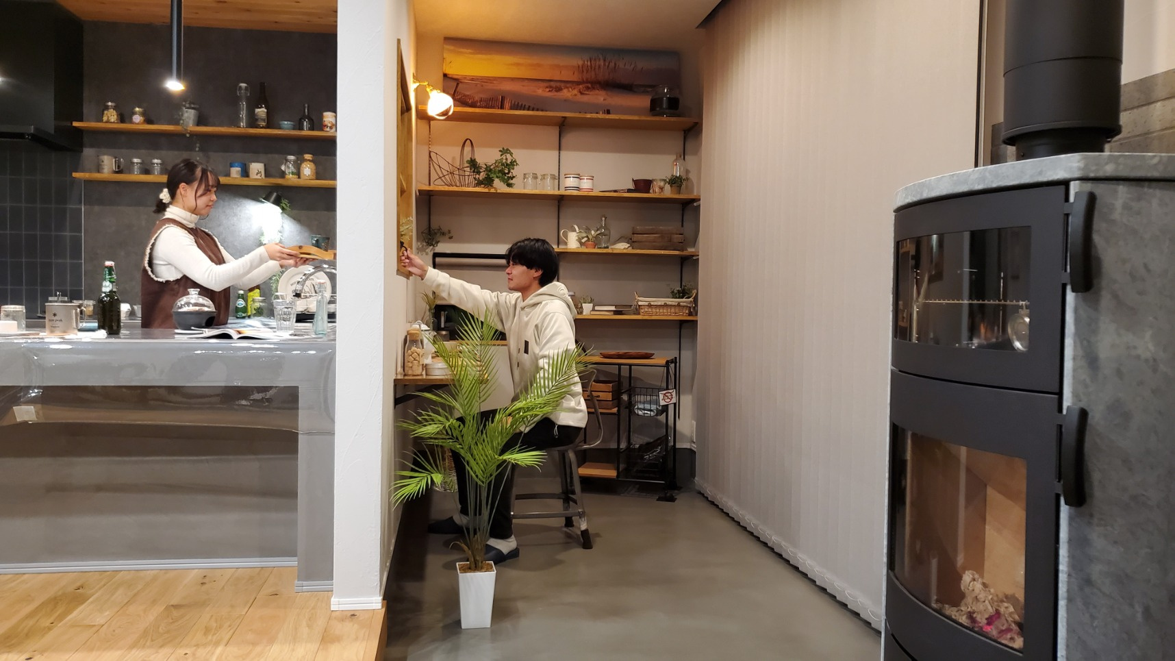 キッチンから土間サロンへはカフェカウンターでカフェキッチンを再現しております。