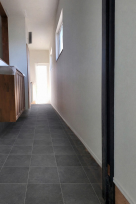 玄関から続く約13mのリビングからタイルテラスまで繋がる通り土間