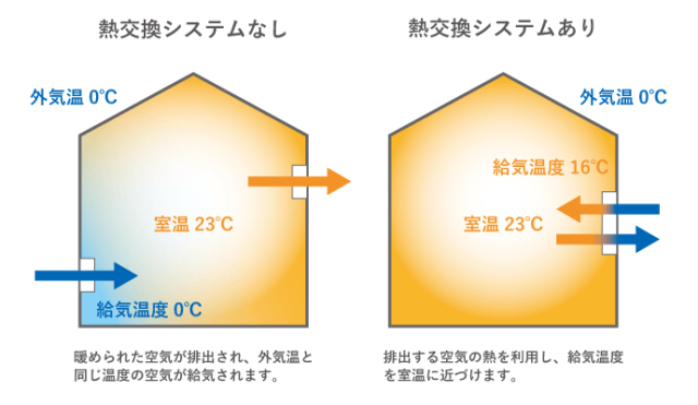 お部屋の汚れた空気を換気しつつ、汚れた空気と一緒に捨てていた熱を給気時に回収して室内に戻すことで熱回収により空調負荷を軽減でき、冷暖房コストを抑えることができる熱交換換気システムを採用しています。