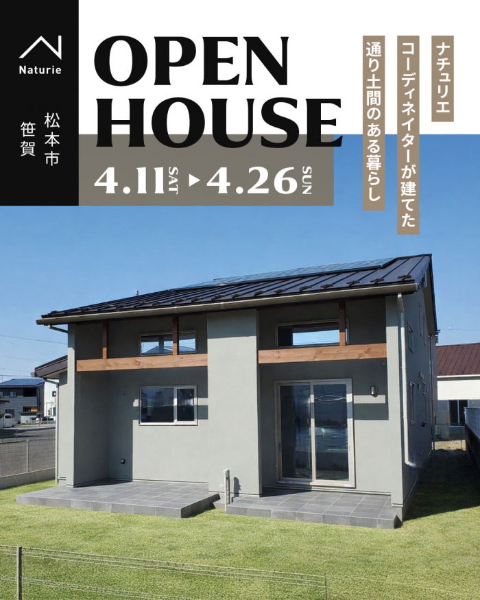 松本市笹賀Naタウン内にて、4月11日㊏~26日㊐の期間に完成見学会を開催させて頂きます。