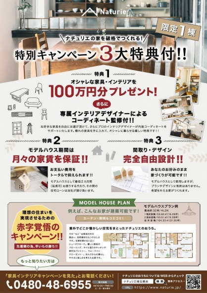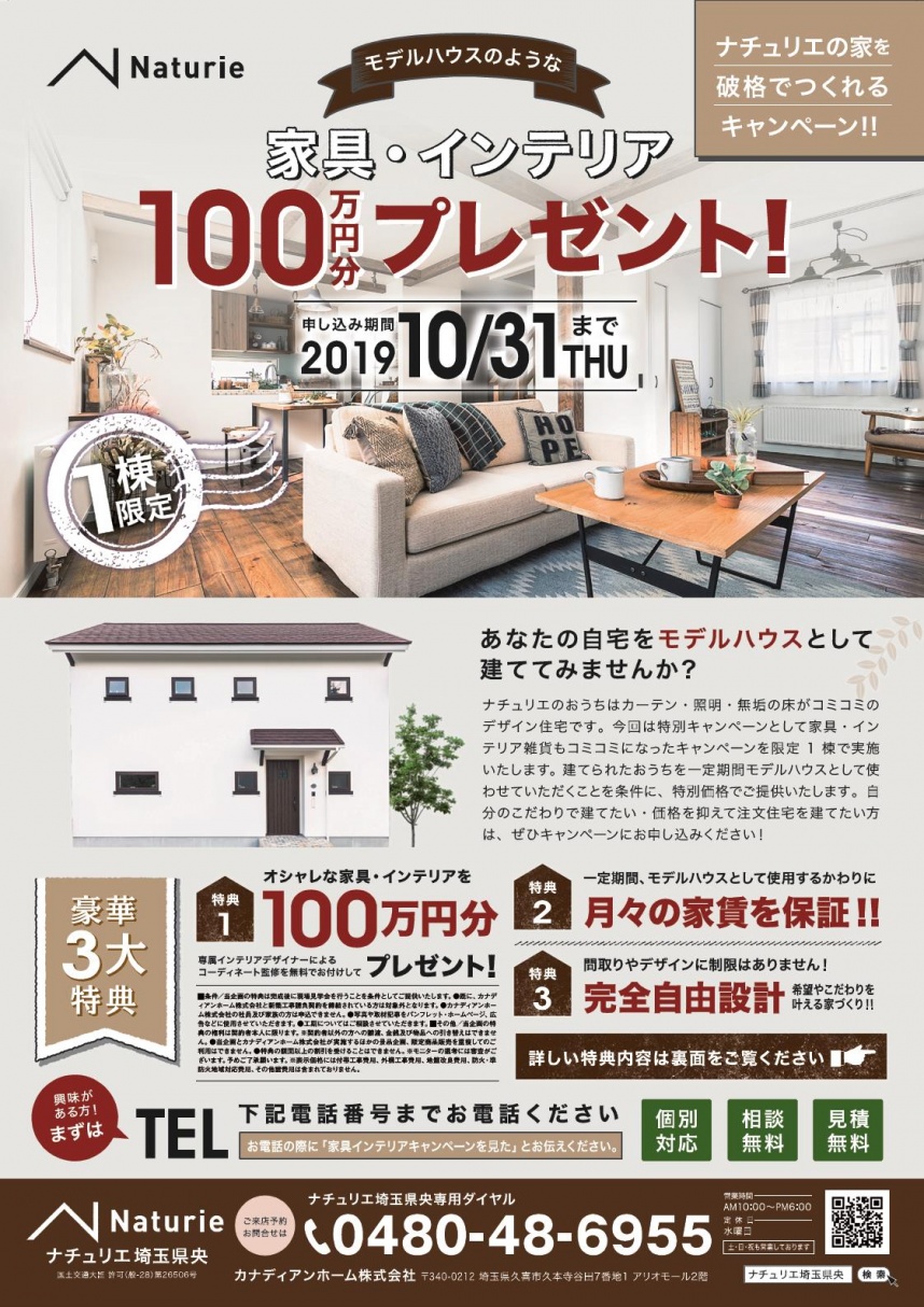 なななんと、今ナチュリエ埼玉県央店でお家を購入し、一定期間(最低2ヶ月間)モデルハウスとして利用させていただくと、家具・インテリア100万円分をプレゼントしちゃいます!