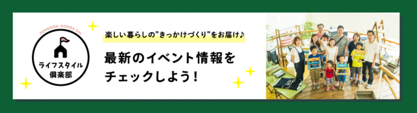 ライフスタイル倶楽部 このイベントは終了いたしました。たくさんのご来場ありがとうございました。 楽しい暮らしのきっかけづくりをお届けする『ライフスタイル倶楽部』 ライフスタイル倶楽部は、ジョンソンホームズのオーナー様に、 カルチャー教室やおけいこなどのライフスタイルイベントをお届けしています。 せっかく建てたのだから、もっと暮らしを楽しんで欲しい、 色々なことに挑戦してほしいという想いから誕生しました。 新しい自分を発見したり、好きなことを見つけたり、素敵な仲間と出会ったり・・・ そんなお手伝いをしていきたいと思います。 私たちと一緒に、今よりももっと「楽しい暮らし」を始めましょう!
