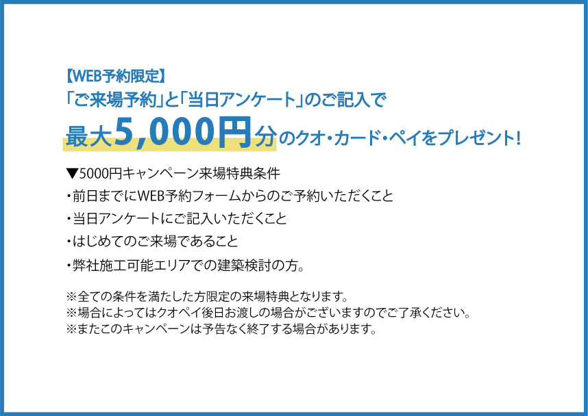 期間限定増額中!事前のご予約、ご来場でQuoカードPay5000円分プレゼント!
