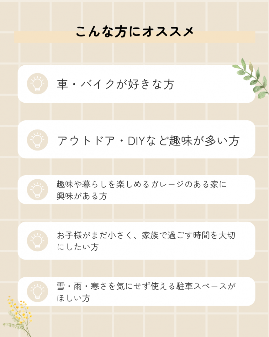 ガレージは、車の保管だけでなく、収納や作業スペース、趣味の場所としても使える多目的な空間です。
