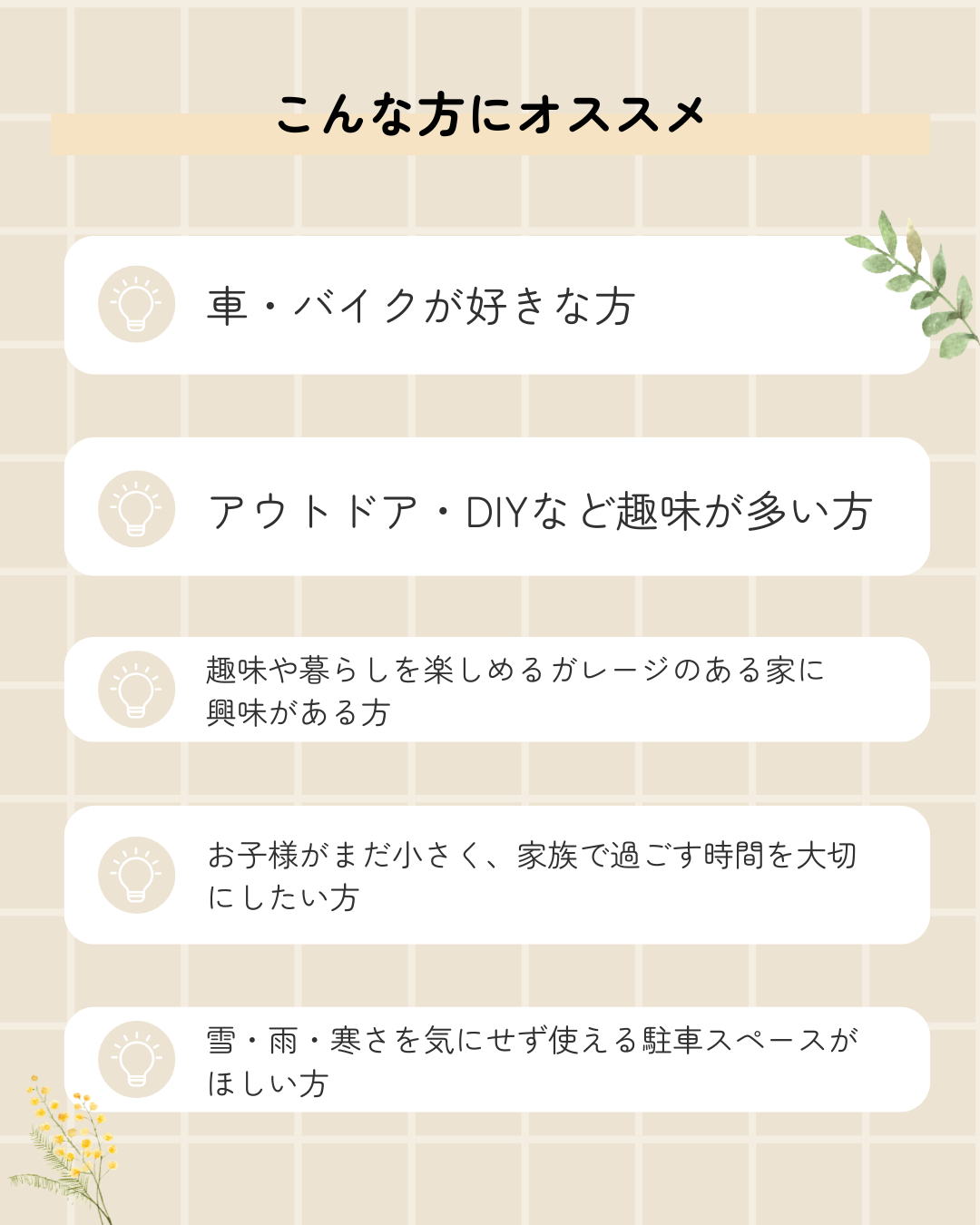 好きなことを無理なく続けられる、使い勝手のよいガレージプランをご相談いただけます。