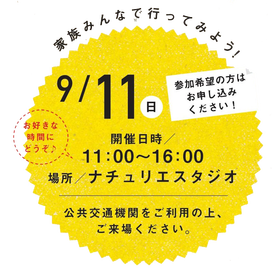 2016年09月11日(日) 今年も「なちゅまつり」でスタッフがおもてなし♪ このイベントは終了いたしました。たくさんのご来場ありがとうございました。 2016 なちゅまつり開催!9/11(日)11:00-16:00下記よりお申込みください※ナチュリエで家を建てたオーナー様限定 下記より、「フルネーム」「参加人数(大人/子どもの数)」「DIYを希望する場合は午前/午後どちらか」をご記入ください。 担当スタッフに直接申し込みしてもOK♪