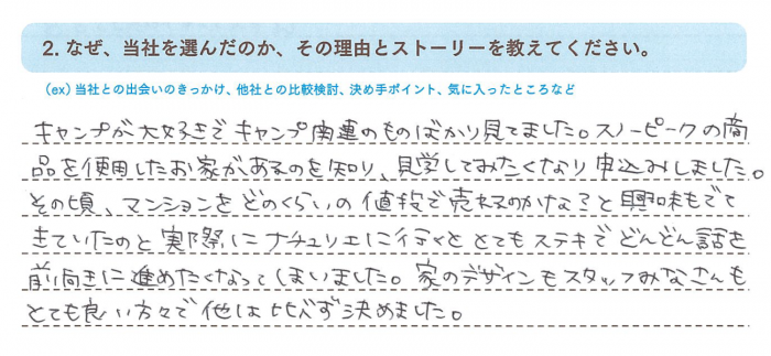 キャンプが大好きでキャンプ関連のものばかり見ていました。スノーピークの商品を使用したお家があるのを知り、見学してみたくなり申し込みました。その頃、マンションをどれくらいの値段で売れるのかな?と興味もでてきていたのと実際にナチュリエに行くととてもステキでどんどん話を前向きに進めたくなってしまいました。家のデザインもスタッフみなさんもとても良い方々で他は比べず決めました。