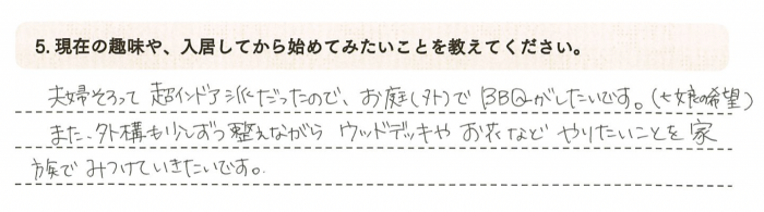 また外構も少しずつ整えながら、ウッドデッキやお花など、やりたいことを家族で見つけていきたいです。