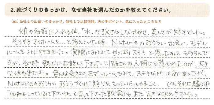 そろそろマイホームを…と考えていた時、Naturieのおうちに出会い、モデルルームを見に行きました。実際に見てみて、やっぱりステキと思ったのはもちろんですが、その時熱心にお話して下さった川筋さんの人柄にも惹かれたのが、大きな決め手でした。色んな会社のモデルルームを見てステキなところはありましたが、Naturieのおうちやおうちづくりに誇りを持っていらっしゃること、でもそれに驕らず「他社もしっかり見て下さいね」と言って下さった誠実さもまた大きな決め手でした。