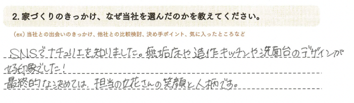 SNSでナチュリエを知りました。無垢床や造作キッチンや洗面台のデザインが好印象でした。