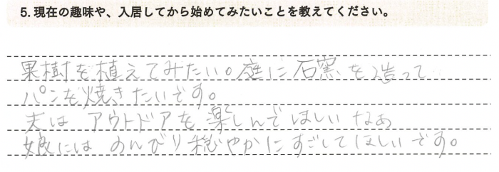 果樹を植えてみたい。庭に石窯を作って、パンを焼きたいです。夫はアウトドアを楽しんで欲しいな。娘にはのんびり穏やかにすごしてほしいです。