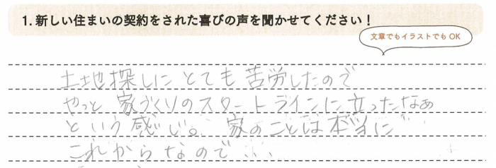 土地探しにとても苦労したので、やっと家づくりのスタートラインに立ったなぁという感じ。家のことは本当にこれからなので。