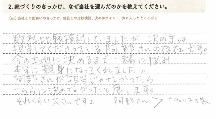 数社比較検討していましたが、決め手は担当してくださっている阿部さんの存在です。今の土地に決めるまで本当に親身になってくれました。阿部さんが担当じゃなかったら、こちらに決めなかったと思います。それぐらい大きいですよ。