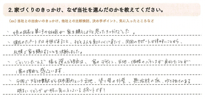 ジョンソンホームズを選んだ理由は、家のデザイン、立地、価格のバランスが良かったことが一番の理由と感じています。平岡で大谷地駅から徒歩圏内という立地、塗り壁の外壁、吹き抜けのある明るいリビングが特に気に入っているポイントです!