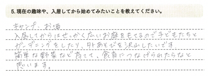 入居してからはせっかく広いお庭をもてるので、子どもたちとガーデニングをしたり、外あそびを沢山したいです。簡単な野菜など育てて、食育につなげられたらなと思います。