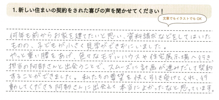 何年も前からお家を建てたいと思い、資料請求などをしてはいたものの、子どもが小さく見学ができずにいました。やっと重い腰をあげ、色々なモデルハウスや住宅展示場へ行き、担当の阿部さんと出会うことで、スムーズに計画が進みだして契約することができました。私たちの要望を快く引き受けてくれ、行動してくださる阿部さんに出会えて本当に良かったなと思っています。