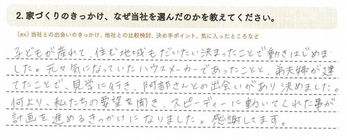 子どもが産まれて、住む地域もだいたい決まったことで、動きはじめました。元々気になっていたハウスメーカーであったことと、弟夫婦が建てたことで見学に行き、阿部さんとの出会いがあり決めました。何より、私たちの要望を聞き、スピーディに動いてくれた事が計画を進めるきっかけになりました。感謝しています。