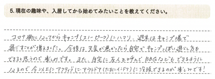 コロナ禍になってからキャンプ(スノーピーク)にハマり、週末はキャンプ場で過ごすことが増えました。今後は天気が悪かったら、自宅でキャンプっぽい過ごし方もできると思うので楽しみです。また、自宅に友人を呼んで、BBQなどもできるようになるので、今以上にアクティブにアウトドア(たまにはインドア)に没頭できるのが楽しみです!