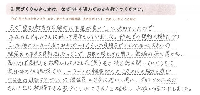 元々「家を建てるなら絶対に平屋が良い!」と決めていたので平屋のモデルハウスに絞って見学をしていました。他社での契約も検討しつつ「一応他のメーカーも見てみようか~」くらいの気持ちで緑苑台の平屋を見学しました。そこでお家の暖かさに驚き、無垢の床に惹かれ・・・気づけば見積もりをお願いしていました。(笑)
